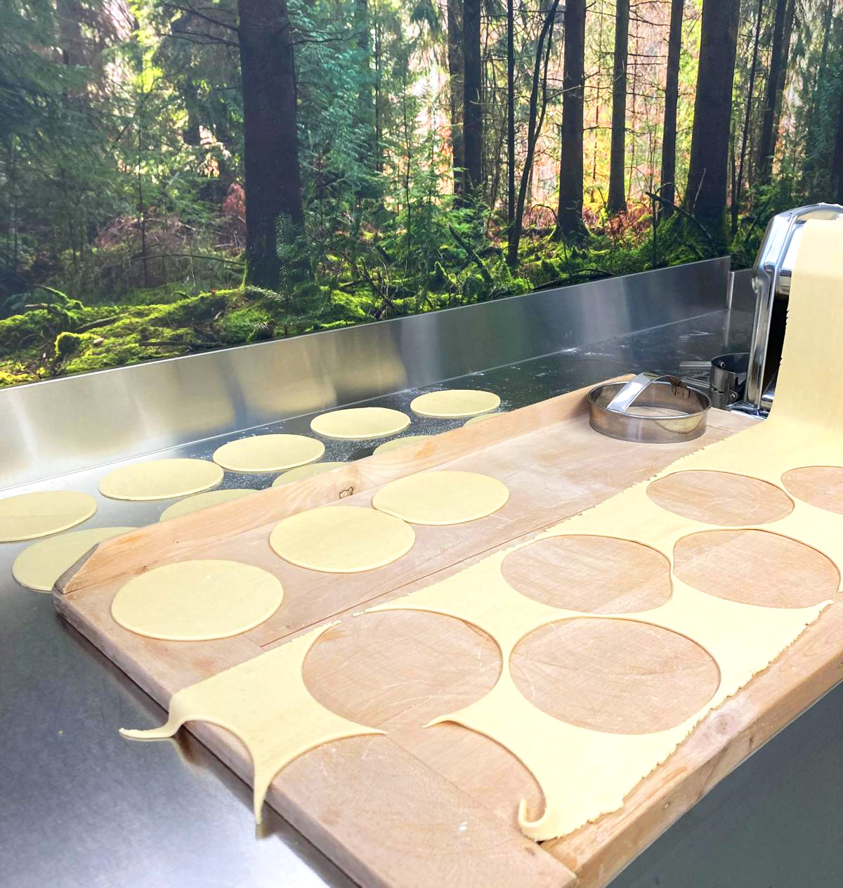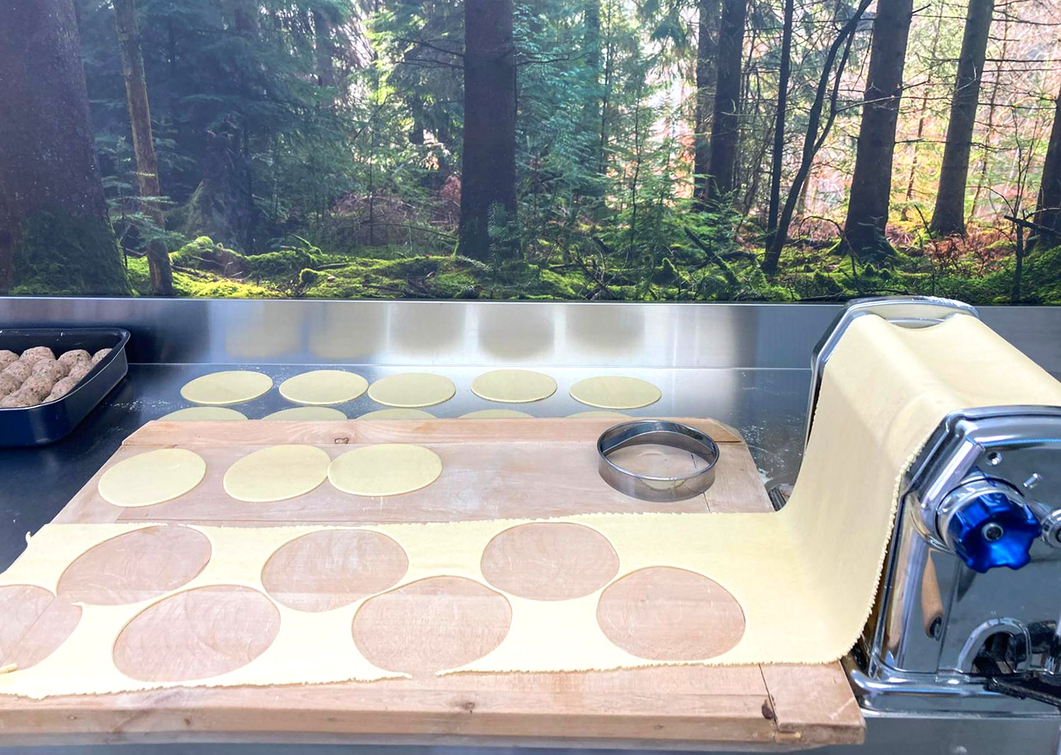 Michael nennt seine Manufaktur „Casa forte“. Und genauso stark ist auch die Philosophie, mit der er seine Kärntner Nudel kreiert. „Nahezu 95 % der Zutaten sind regional. Der Bröseltopfen für die Käsnudel stammt vom Hof der Familie Glanzer in Zweinitz und wird eigens für mich produziert“, erzählt Michael stolz. „Die Kräuter baue ich selbst an, Fleisch beziehe ich aus der unmittelbaren Umgebung und die Kartoffeln wachsen im Glantal.“